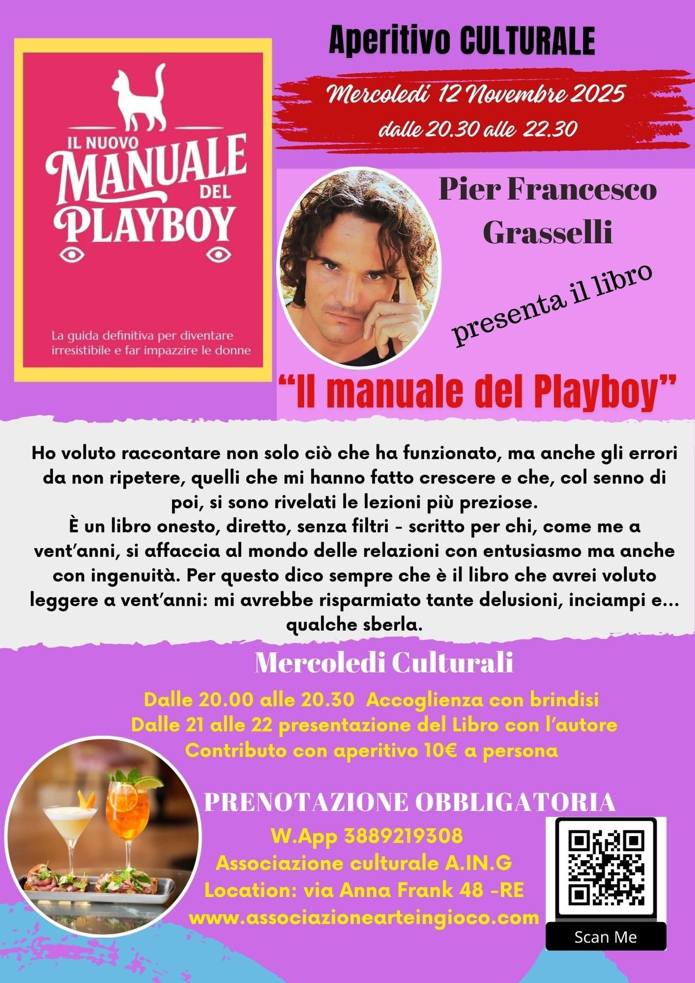 Aperitivo Culturale con l'Autore Pier Francesco Grasselli con il suo ultimo libro: "Il Manuale del PlayBoy". Nell'era dell'imbarbarimento e della perversione globale, delle deviazioni incentivate dai media, del tatuaggio e delle unghie finte, della cafonaggine e della volgarità, della sovraesposizione mediatica e dell'alienazione digitale, un inno allo stile, al savoir faire, alla cavalleria, alla virilità che non si piega e che rispetta e valorizza la donna ben più di quanto non la rispetti il femminismo radicale odierno, degenerato nella criminalizzazione del maschio e nella svalutazione della femmina.