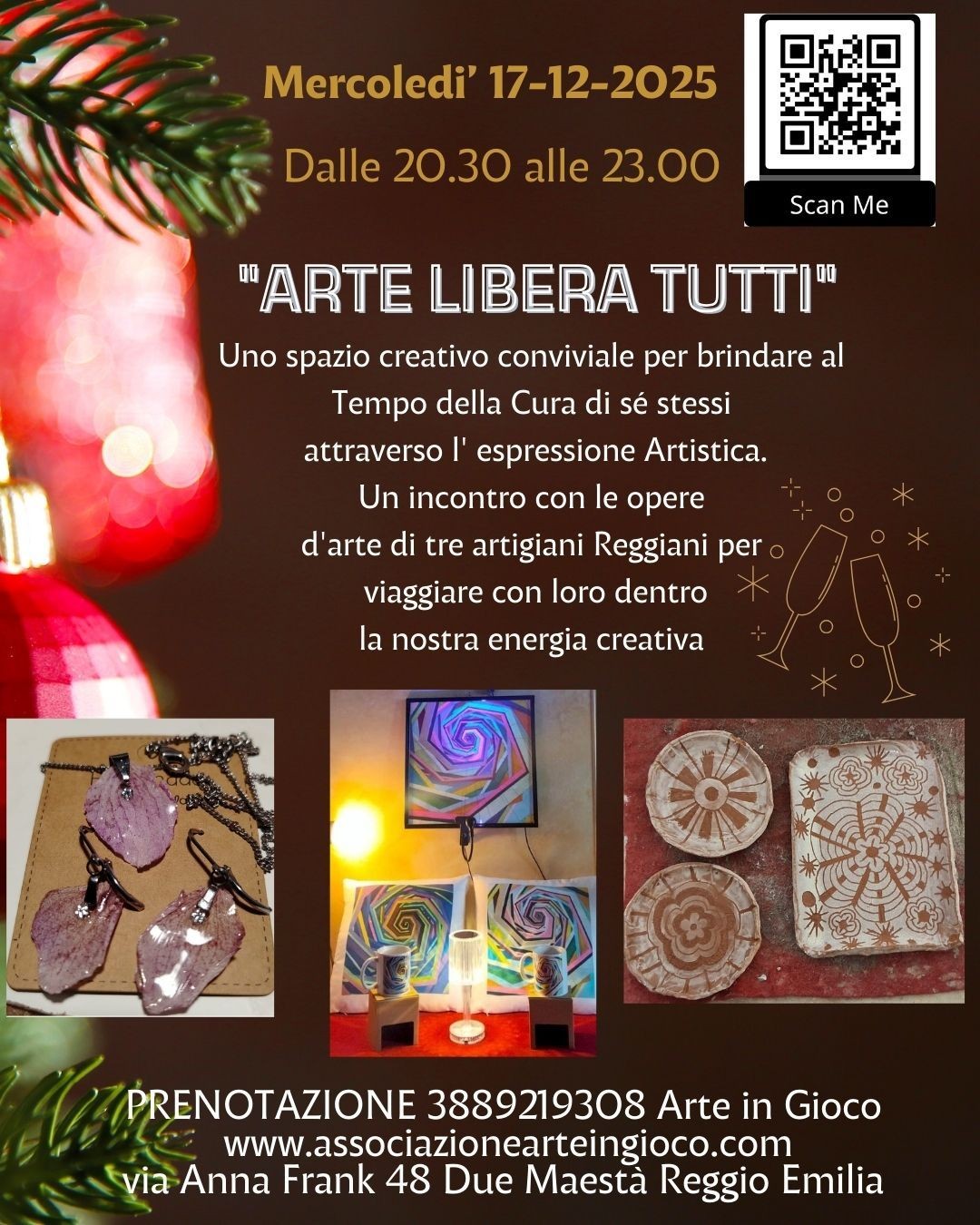 Un dopocena per brindare all' incontro della nostra espressività artistica con tre Artigiani Reggiani: Maria Livia Cingi: con i suoi Mandala luminosi - Monica Ascari con i suoi Gioielli del cuore - Giovanni Coli con le sue Terrecrete.